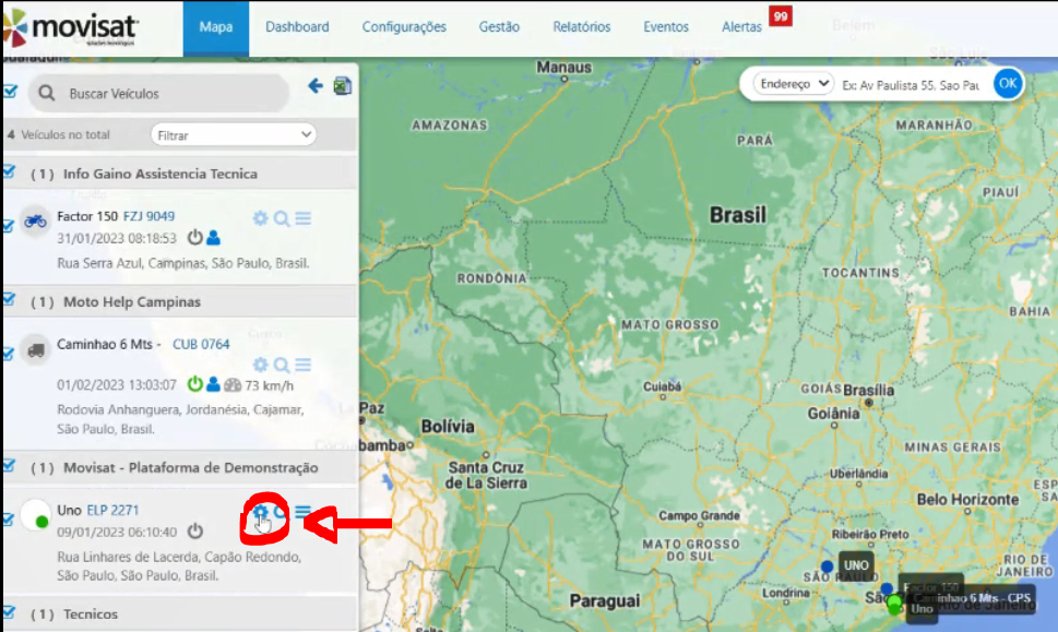 No Grid de veículos na tela do mapa, selecione o ícone de engrenagem conforme imagem abaixo: