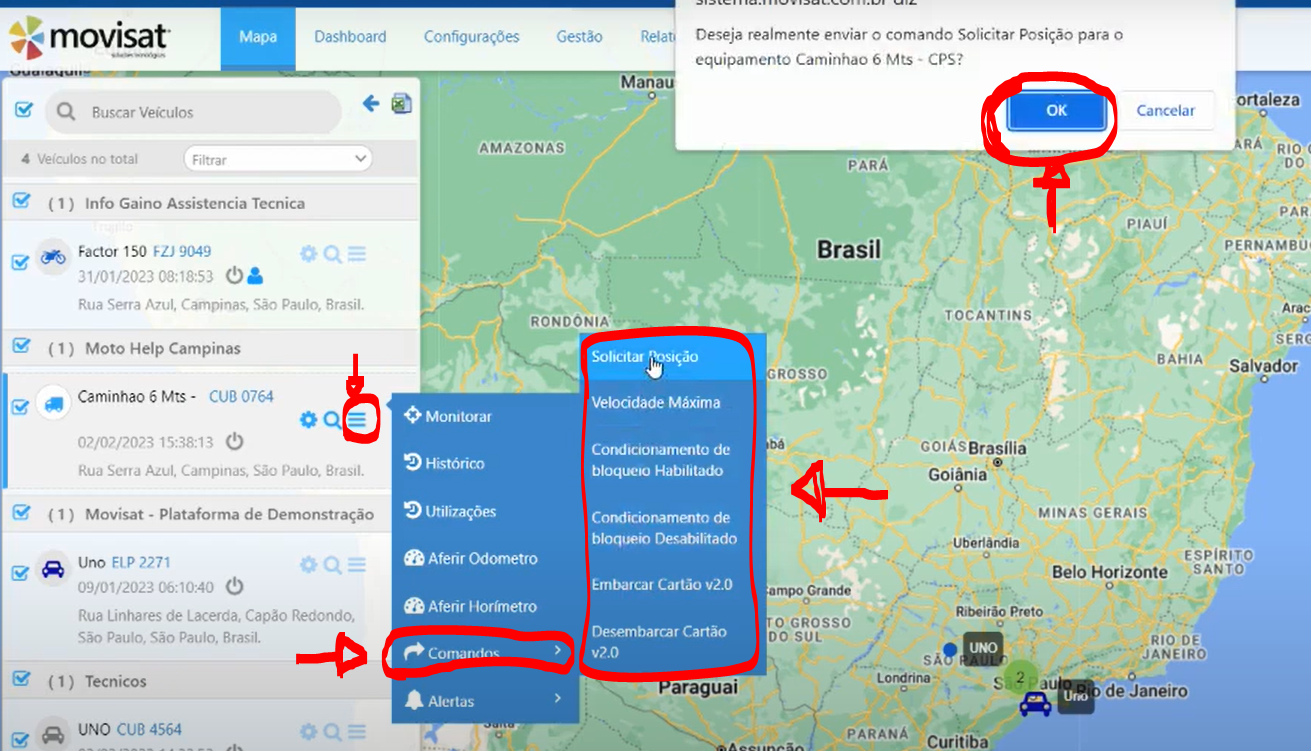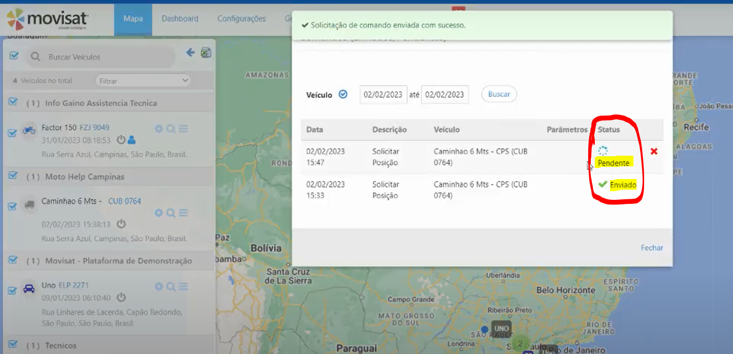 Para enviar um comando, clique no ícone "Lista" que fica ao lado da placa desejada no grid de veículos.