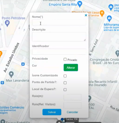 - Ponto de partida, Local de espera, Raio(m) e Raio (Rel. Visitas): Configuração padrão para atuar com módulos de Entregas e Visitas;