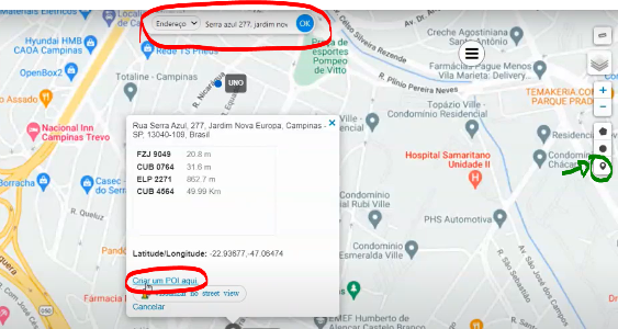- [Opção 1] Criar visualmente no mapa clicando no botão POI situado no canto direito da tela (marcação verde na imagem);